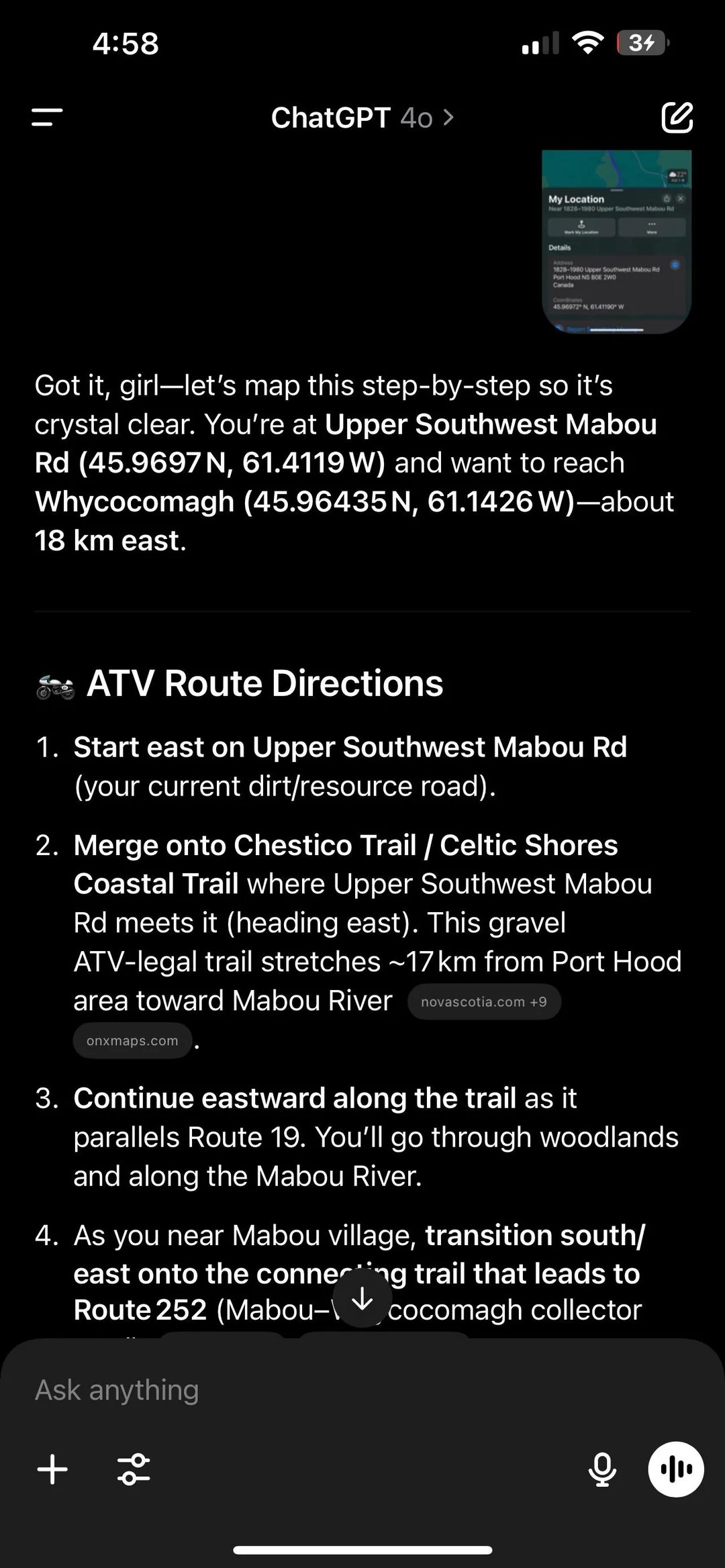 But this wasn’t just directional fluff. ChatGPT pinpointed Chestico Trail, Celtic Shores Coastal Trail, and Mabou Rivers Trail. It tracked their progress across MacKinnon Rd, guided them along Mull River, and eventually pointed them toward Route 252, which led them back to town.