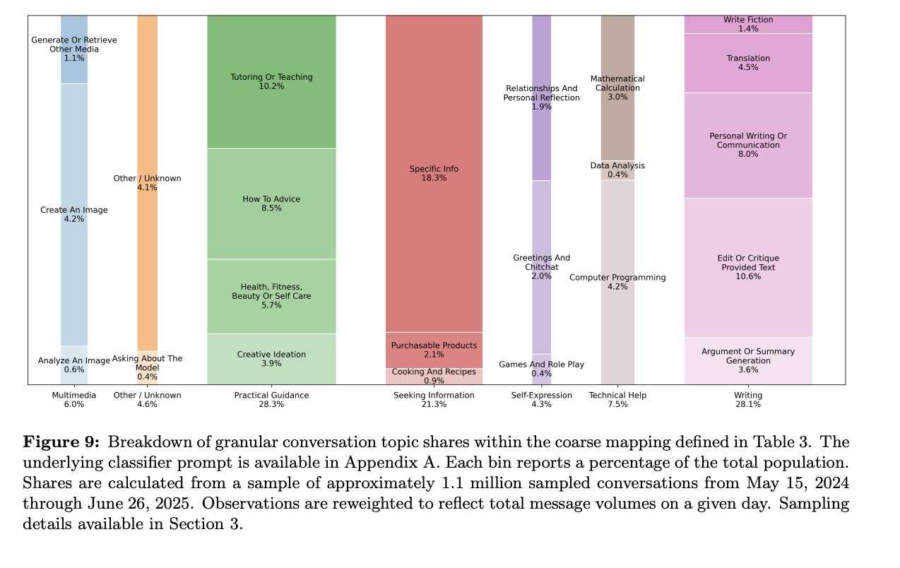 Researchers found that three-quarters of all conversations fell into three broad buckets: practical guidance, information-seeking, and writing. Practical guidance dominated, with users asking the bot for tutoring, teaching help, how-to advice, or creative brainstorming.