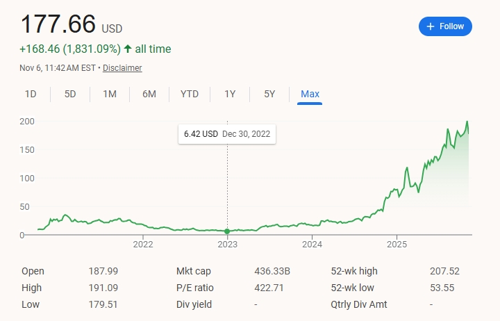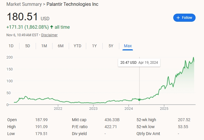 After years of trading sideways, Palantir’s real breakout began in late 2022, when its stock hovered around $6.42 a share. As the ChatGPT-fueled AI mania gripped Wall Street, the stock went vertical—soaring more than 2,600% to reach today’s levels near $180. That meteoric rise, condensed into less than three years, is what turned Palantir from a niche defense contractor into the face of speculative AI optimism.