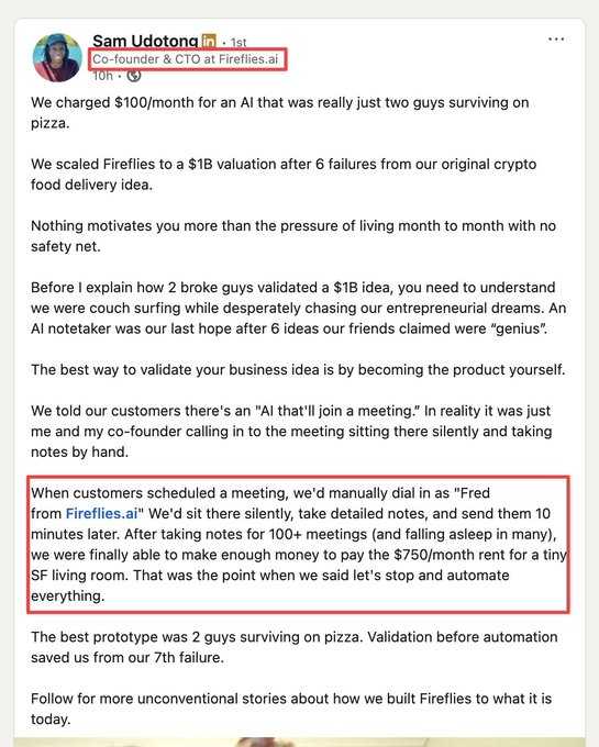 The story comes straight from MIT alum Sam Udotong, Fireflies’ co-founder and CTO, who recently shared the company’s humble beginnings in a viral LinkedIn post. Long before investors lined up to back “AI-powered” meeting tools, Udotong and his co-founder Krish Ramineni were just two broke founders trying to validate an idea — any idea — that people would actually pay for.