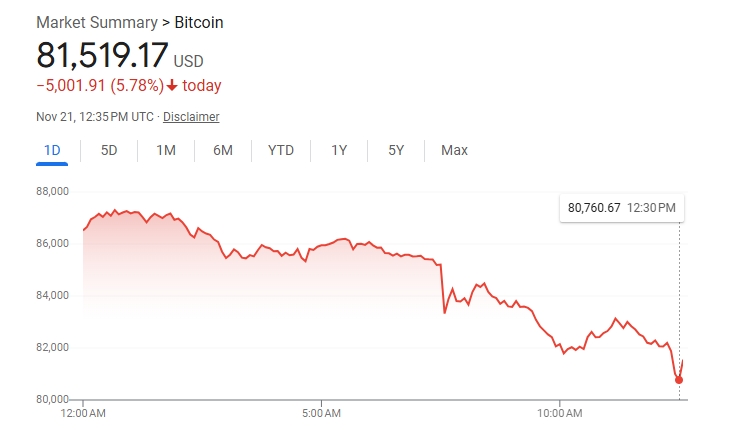 The price of the world’s most popular cryptocurrency plunged as low as $80,760, wiping out Thursday’s short-lived rebound and extending a brutal month-long slide that has erased more than $1.4 trillion from the broader crypto market. Once riding high on late-summer momentum, bitcoin is now trading over 30% below its October peak, with the entire crypto market slipping under the $3 trillion mark.