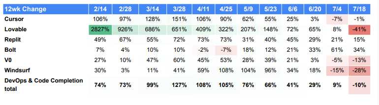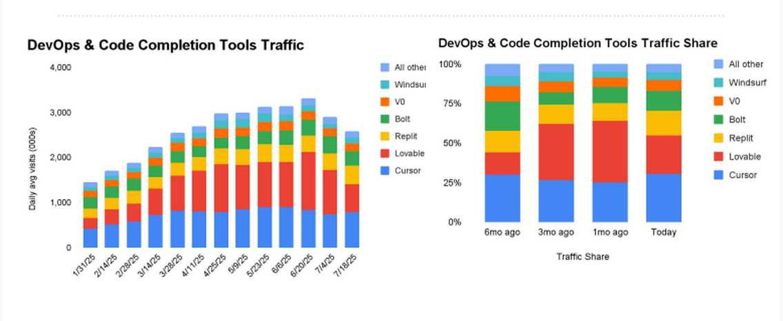 The latest report from SimilarWeb also supports Turnbull’s post. According to the report, popular AI-vibe coding tools have seen a sharp decline in traffic since their peak early this year. Below is a table of changes in popular code completion & DevOps tools from February through July.