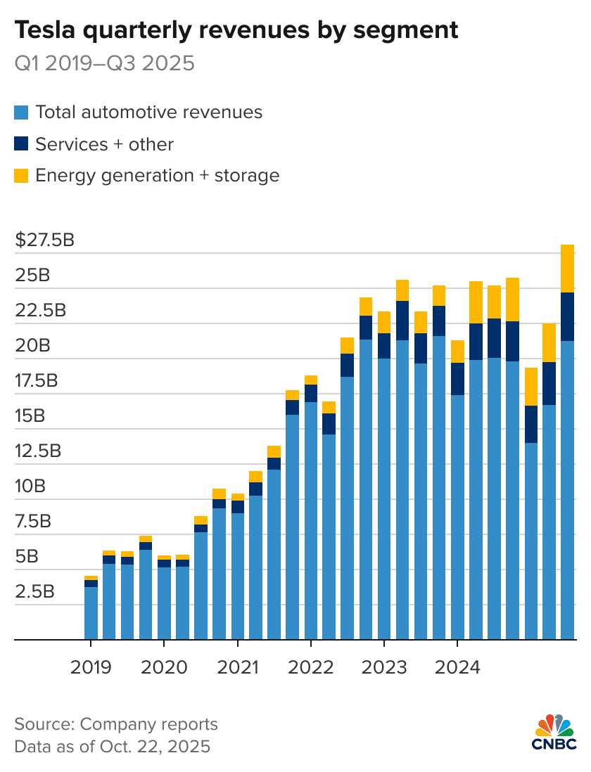 Tesla Quarterly Revenue by Segments (Credit: CNBC)