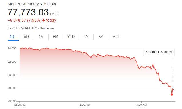 Bitcoin slipped to $77,091, its lowest level since April 2025, shaking confidence across crypto markets and triggering one of the sharpest pullbacks in months. The move dragged the broader market lower and erased more than $1 trillion in total crypto value, yet Bitcoin still held up better than assets long viewed as safer.
