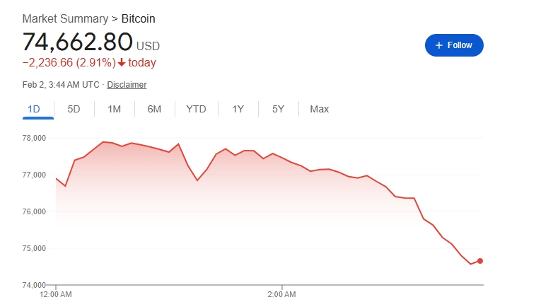 Bitcoin crashes to $74,662.80, triggering $2.5 billion in liquidations across crypto markets