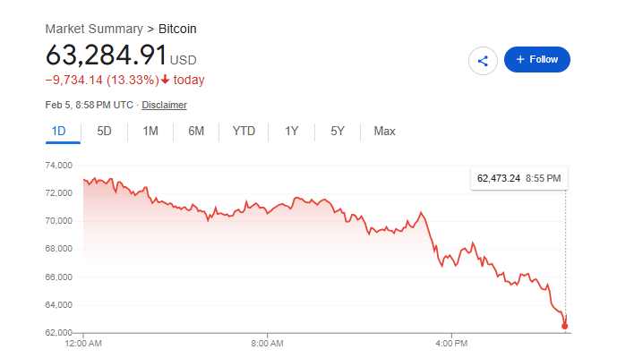 [Update 3] 3:55 PM ET, February 5, 2026: Bitcoin extended losses into the afternoon, now trading at $62,473.24, down more than 9% on the day.