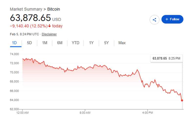 Update 10:27 AM ET, February 5, 2026: Bitcoin extended losses into the afternoon, falling further to approximately $67,706, down more than 7% on the day. The continued slide underscores persistent selling pressure as crypto markets remain volatile and risk appetite stays subdued.