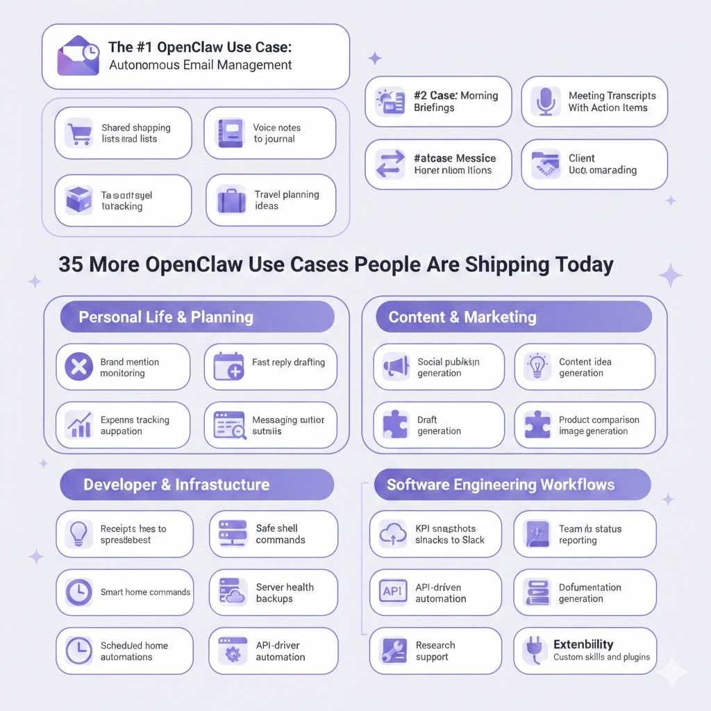Beyond email and morning briefings, OpenClaw is already running quietly across daily routines, work setups, and personal systems. These are real use cases people are deploying right now, many of them small on their own, but meaningful in aggregate.