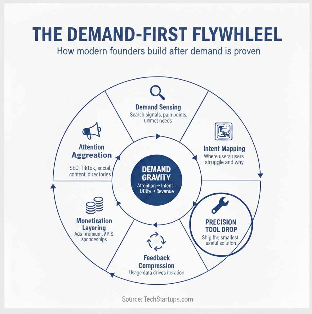 The Demand-First Flywheel shows how modern builders validate demand before shipping a product. (Source: TechStartups)